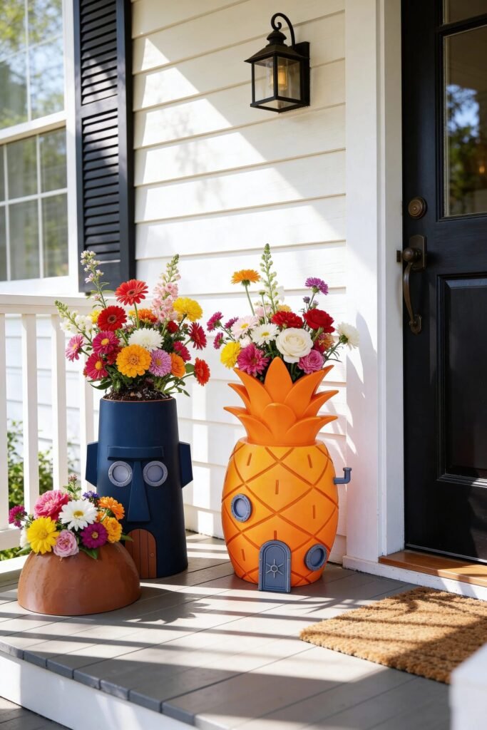 Some front porches try to look elegant. Others decide to have personality. These playful character planters fall firmly into the second category, and honestly… we love the confidence. By turning containers into sculptural objects, the porch instantly gains a focal point before guests even knock. Statement planters work because they introduce visual storytelling, not just flowers. The pineapple shape adds height and vertical emphasis, while the darker sculptural planter grounds the arrangement with contrast.