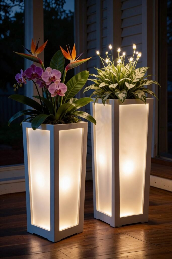 Plant selection matters here because the lighting highlights shape and silhouette. Orchids, bird-of-paradise, and structured foliage stand out dramatically once the light shines through the planter panels. Tall plants with defined leaves work best because they create striking shadows and visual drama.