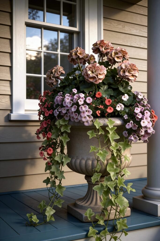 Trailing ivy and delicate white flowers finish the composition by softening the edge of the pot. That slight spillover effect is important because it visually connects the planter to the porch floor instead of leaving it floating awkwardly.