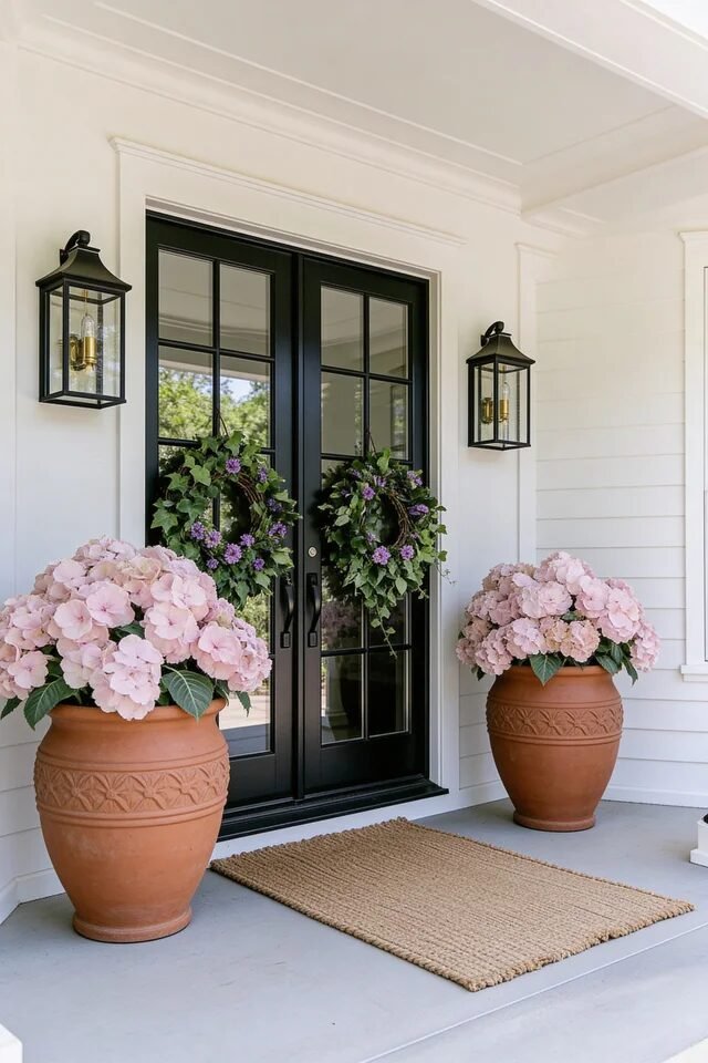 Large entryways deserve planters that can hold their own, and these oversized urns absolutely understood the assignment. Scale is everything in porch design, and using small pots here would make the doorway feel even bigger and emptier. The large urns visually anchor the entry and balance the tall doors.