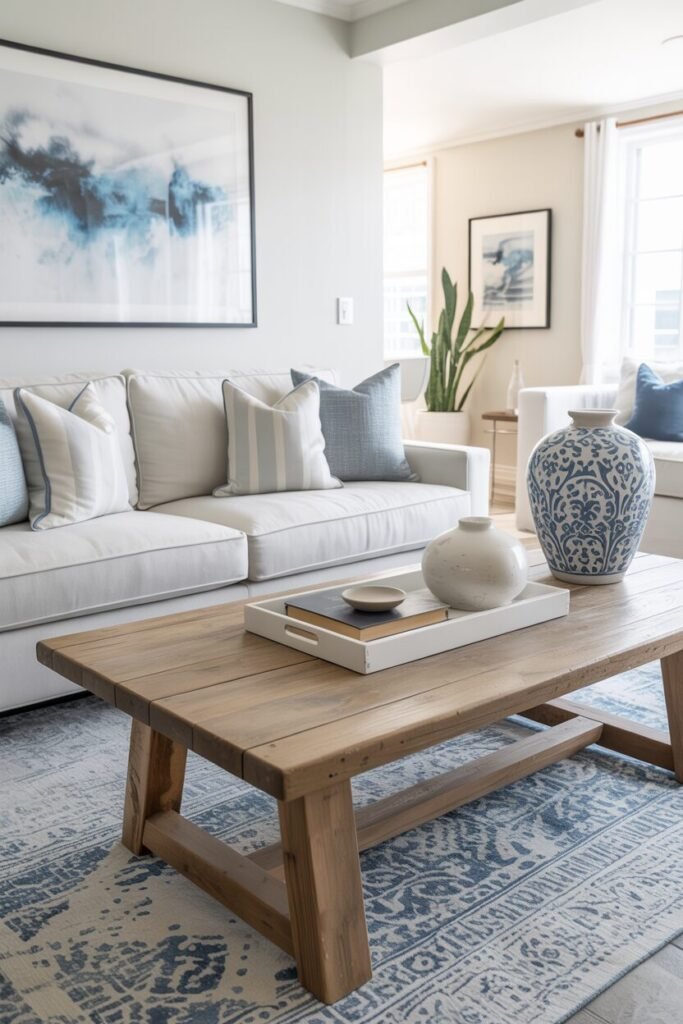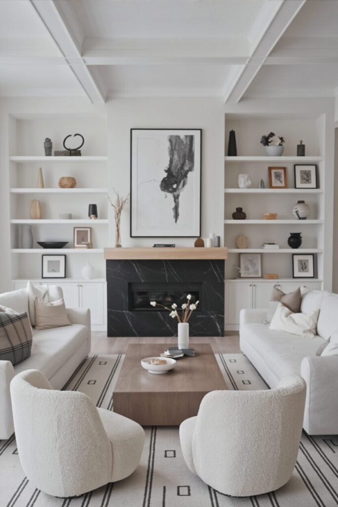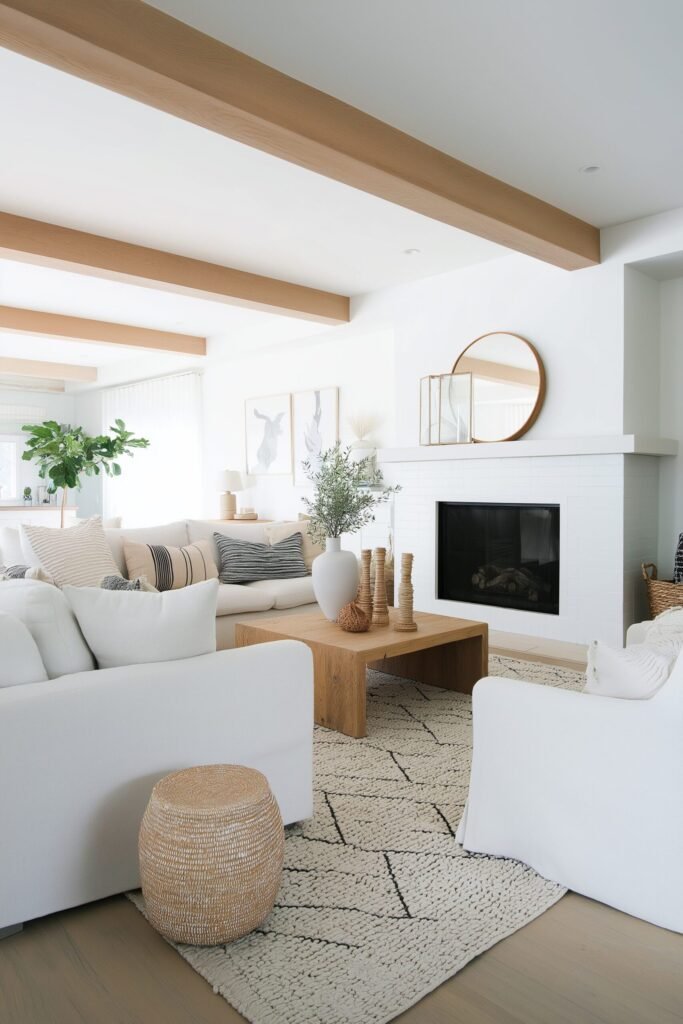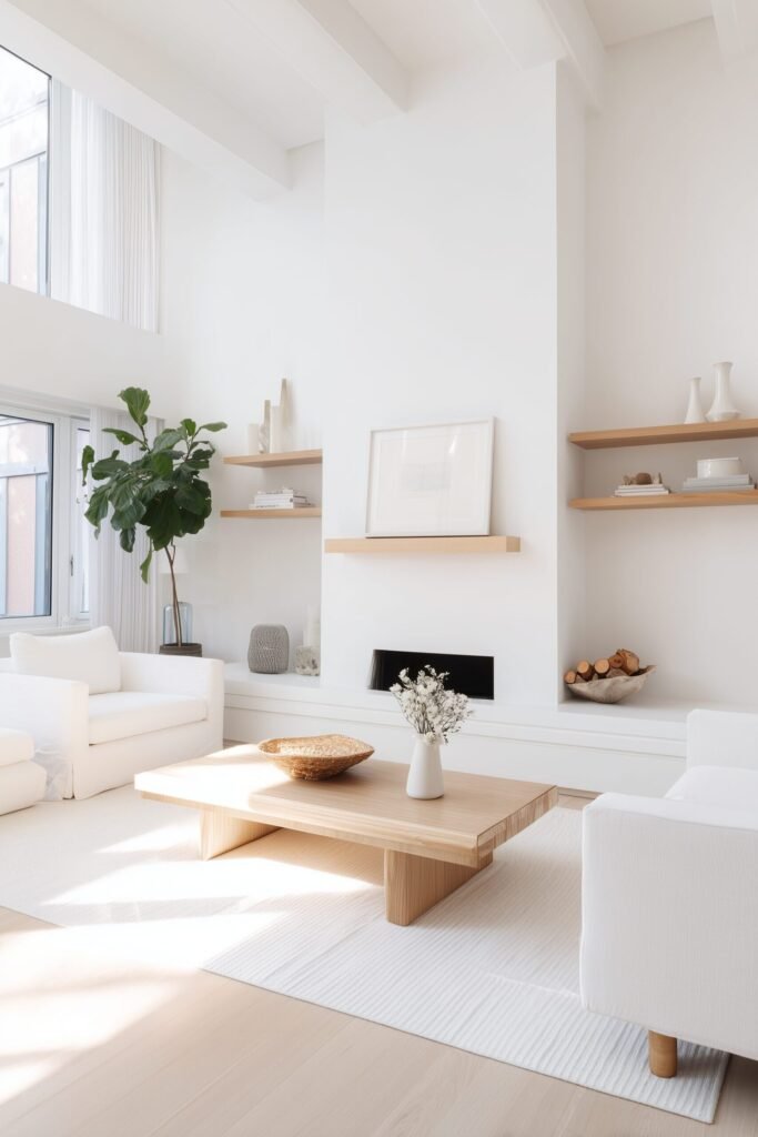 The secret is to bring in natural wood accents. As you can see in these incredible spaces, wood acts like an instant shot of warmth, grounding the entire design with an organic, earthy touch. From a beautifully rugged coffee table to those sleek floating shelves or even stunning ceiling beams, every piece of wood provides a much-needed natural contrast to crisp white walls.