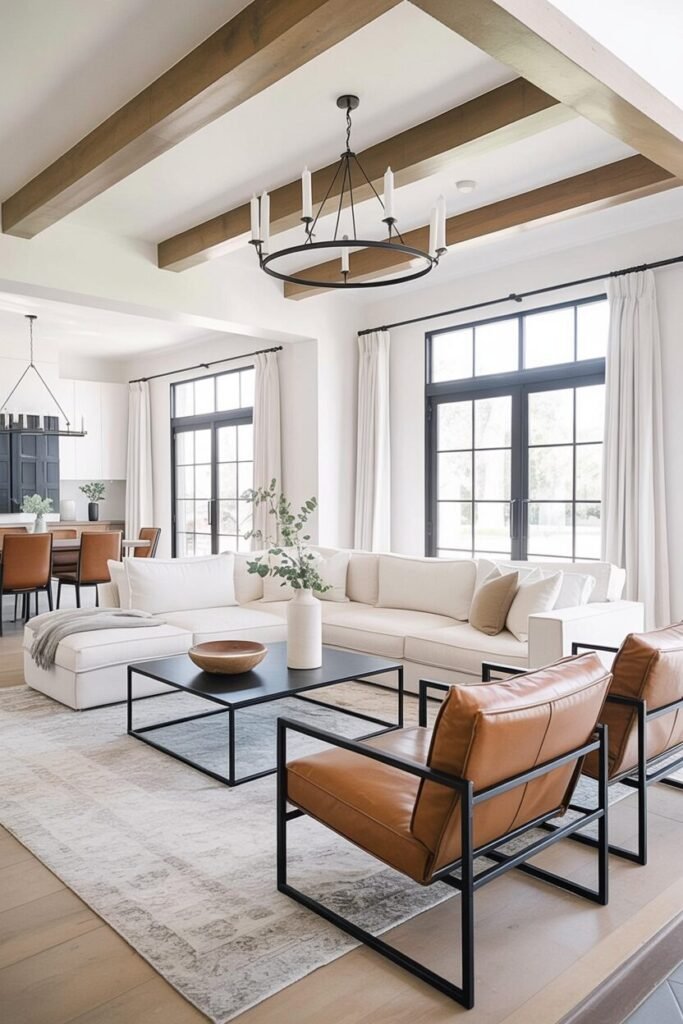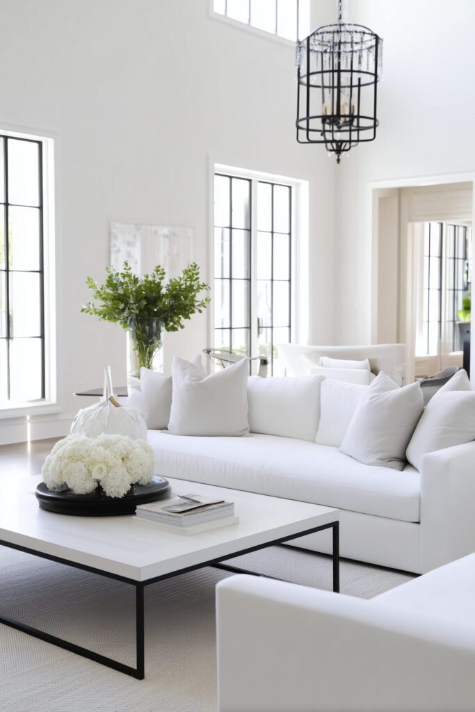 This powerful design principle of contrast prevents a room from feeling washed out. See how the black lines of the windows and the sleek coffee table bases act as a vital visual anchor? They add structure, depth, and sophistication that you just can’t get with an all-white palette.