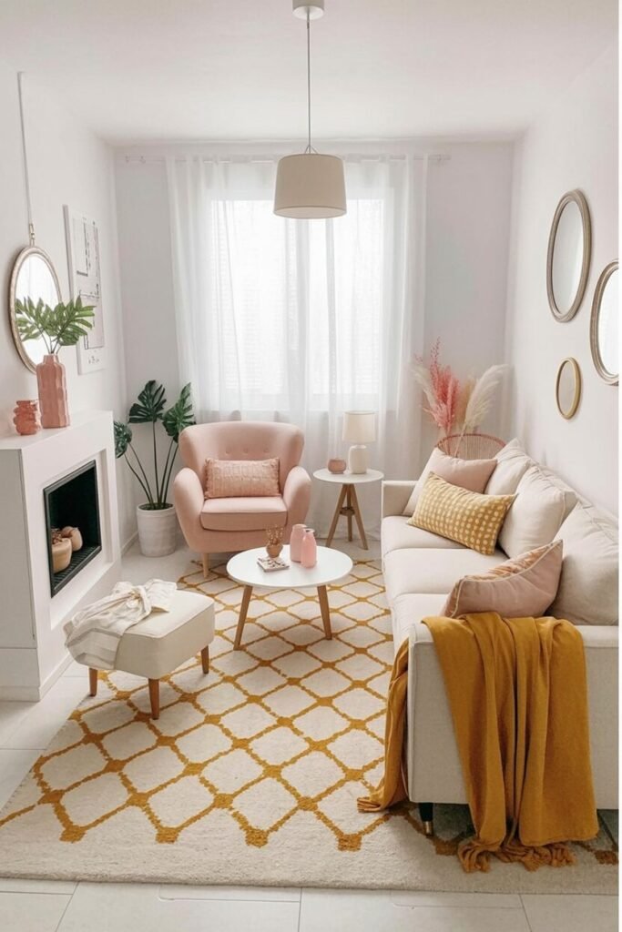 The blush pink and mustard yellow aren’t just one-off accents. The colors are carefully repeated in the armchair, the throw, the pillows, and the rug. This design principle of repetition makes the space feel intentional and cohesive, not accidental.