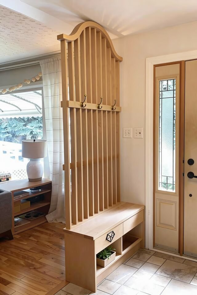 This entry divider is doing three jobs at once, and honestly, that’s elite behavior. The vertical wood slats create visual separation without blocking light, which is a core space-planning principle for small or open layouts. We still feel flow, but the entry suddenly has boundaries.