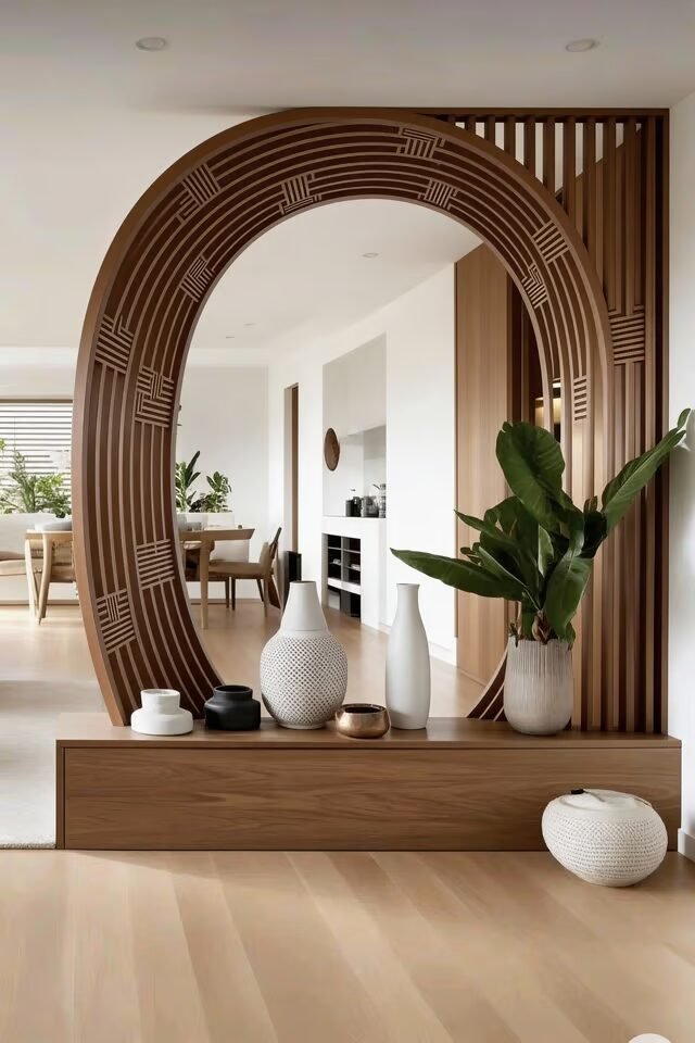We love how it separates the entry visually while still acting as a focal point. The low console anchors the structure, keeping the height from feeling top-heavy. That’s proportion control, not magic. Decor styling here is minimal for a reason. When the structure is bold, accessories should whisper. Let one hero element lead, always. The wood detailing inside the arch adds texture and shadow play, which keeps it interesting throughout the day as light shifts.