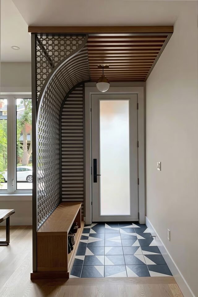 Pairing it with a bench anchors the space and gives the entry a purpose beyond “walk-through zone.” Ceiling slats echo the divider’s lines, creating continuity, which is a huge win. When elements repeat, spaces feel intentional, not accidental. The tiled floor adds contrast and signals transition from outside to inside, reinforcing the entry’s role.