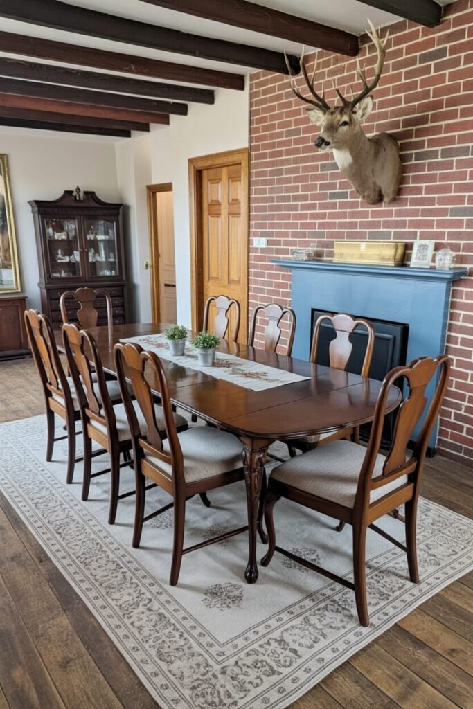 This dining room is giving “grandma’s house, but make it editorial.” The carved wood furniture brings that classic farmhouse formality, but the exposed beams and brick wall instantly warm everything up. What keeps it from looking dated is contrast and intentional layering.