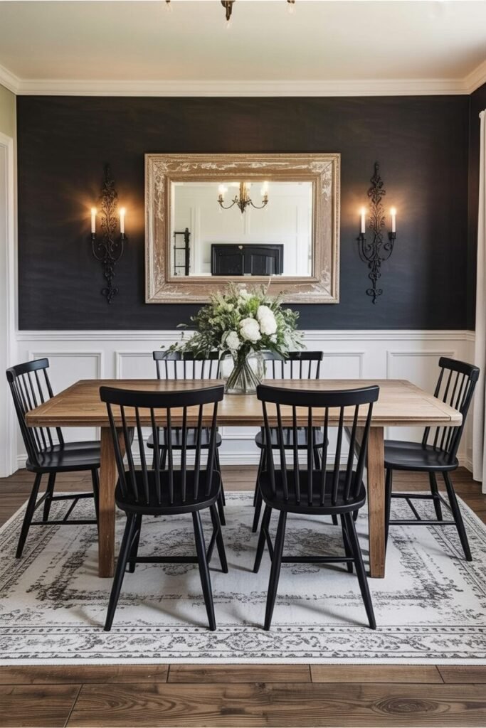 This dining room is basically a masterclass in using contrast without making your house look like a cave. The dark wall adds instant depth and drama, but the white wainscoting keeps the lower half bright, balancing light and shadow beautifully.
