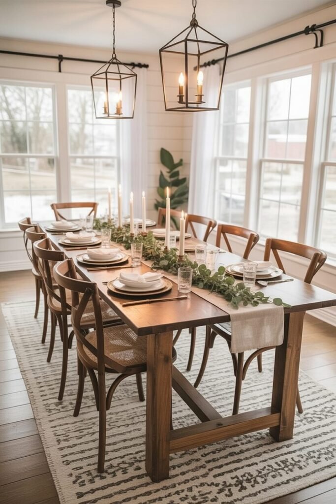 This dining room is the poster child for “effortless” farmhouse—every detail feels warm, lived-in, and host-ready. The wood table with a trestle-style base brings rustic charm while the curved-back chairs soften the geometry of the space.