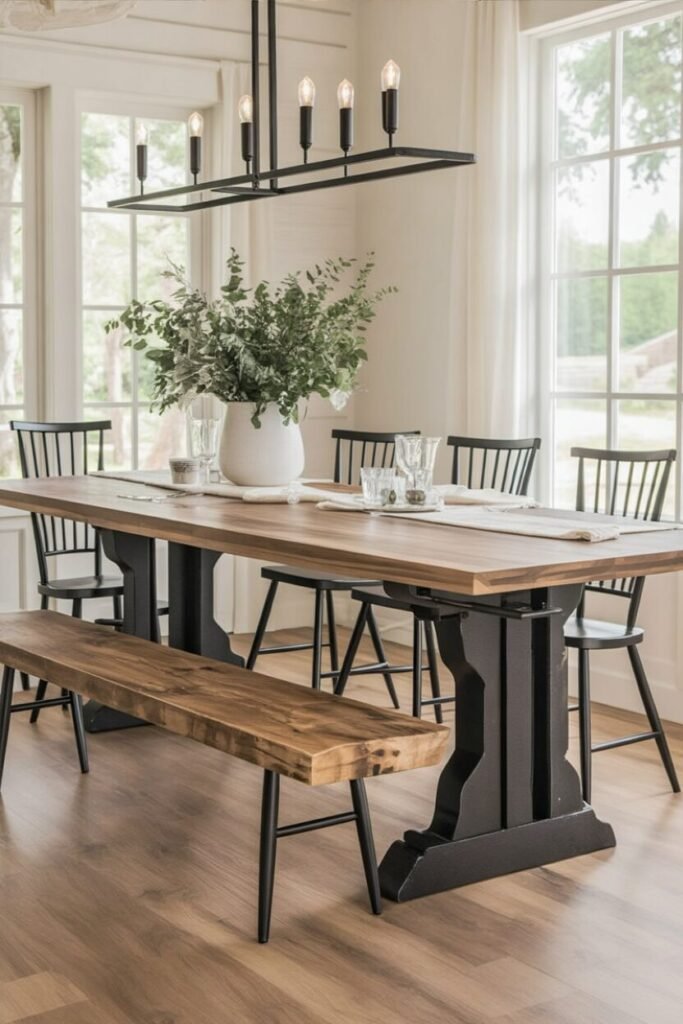 This look is basically farmhouse fitness: strong lines, sturdy furniture, and absolutely zero fuss. The pedestal-style table with a contrasting black base instantly anchors the space, while the matching bench adds functionality and visual variety.