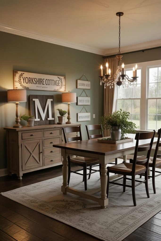 This dining room nails the cozy cottage vibe without slipping into clutter, thanks to intentional layering. The sage green accent wall immediately warms the space, while the wood table and chairs echo the same earthy palette. Wall décor is layered but curated, creating height variation and visual narrative without overwhelming the eye.