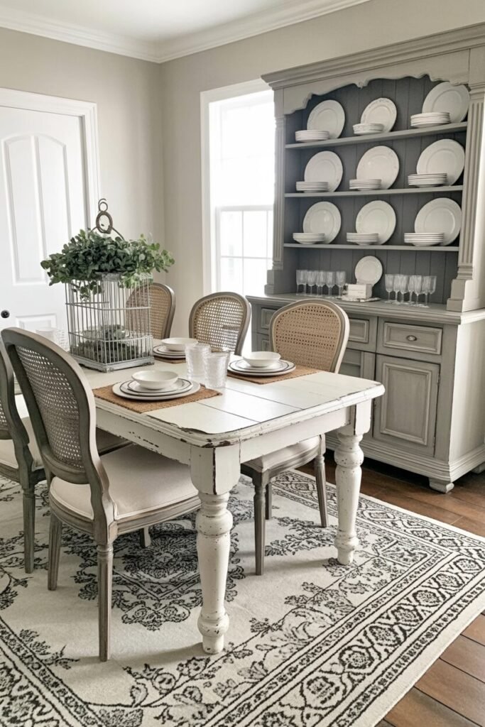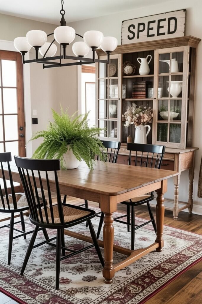 This dining room is the definition of “farmhouse, but make it collected.” The standout piece is the tall china cabinet, which adds vertical structure and gives the space a curated, old-soul personality. The warm wood table and black spindle chairs keep things grounded, while the bold red-patterned rug heats up the color palette.