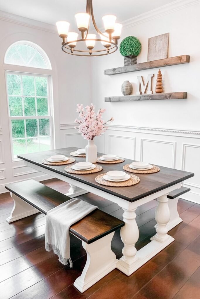 This space is bright, clean, and totally playing in the “Southern Living but make it TikTok-friendly” sandbox. The white walls and trim act as a blank canvas, letting the chunky turned-leg table become the star. The long benches reinforce horizontal flow, making the room feel wider and more social.